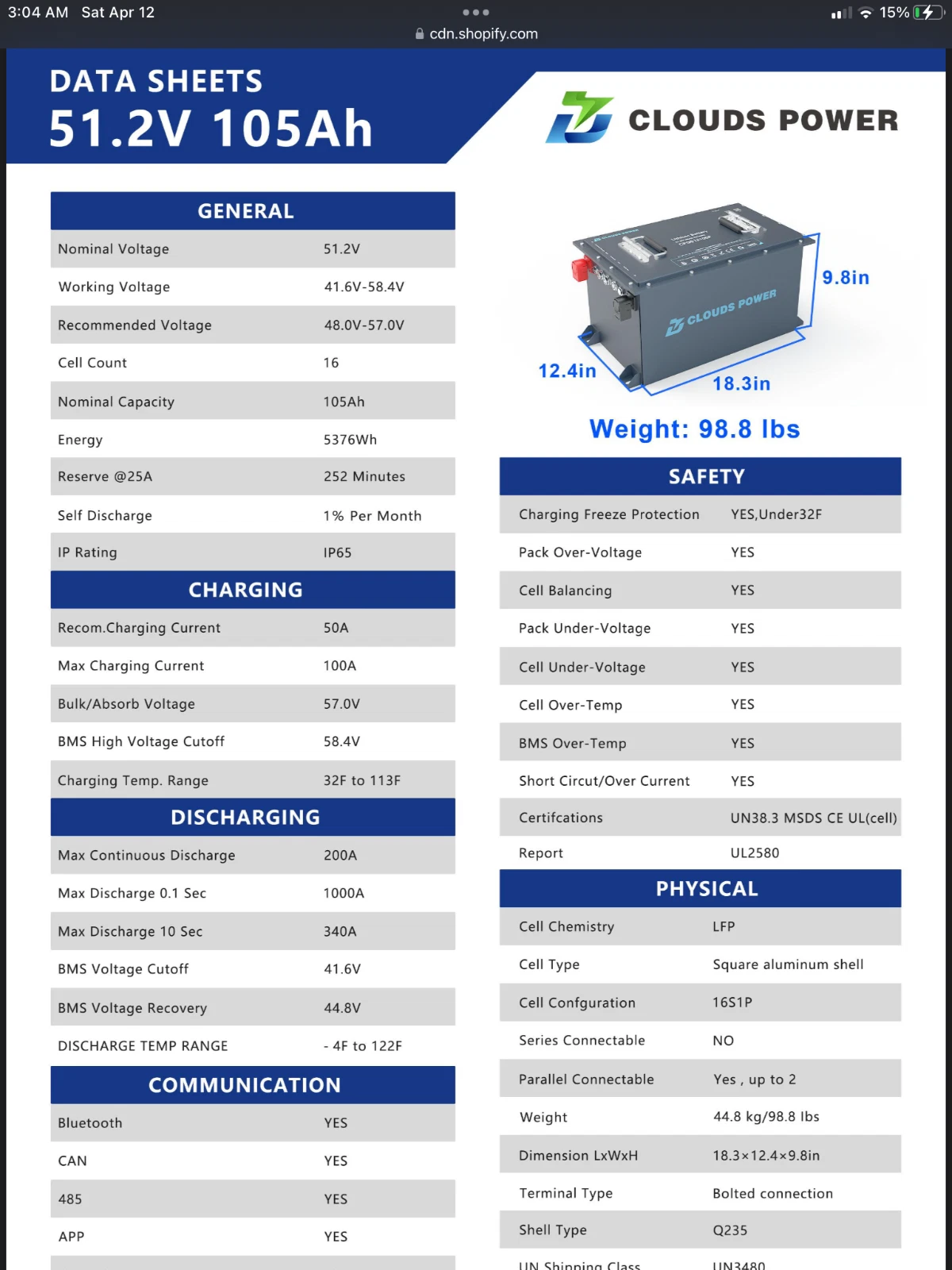 A fully charged 48V 105AH Clouds Power battery can travel up to 50 miles on a charge, and weighs 98.8 pounds. Lithium rechargeable batteries can cycle approximately 4,000 times – more than 4 times comparing with lead-acid batteries.